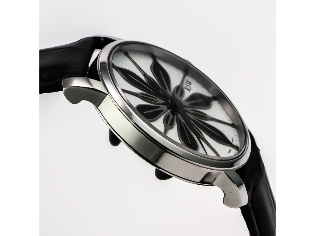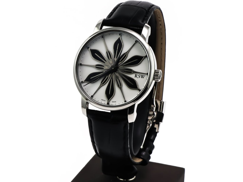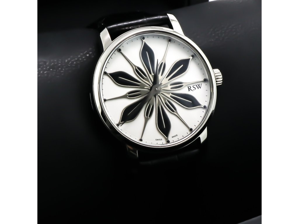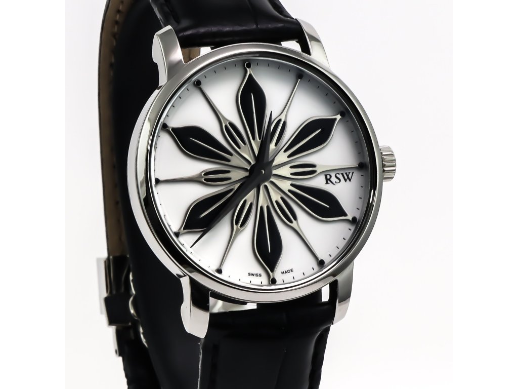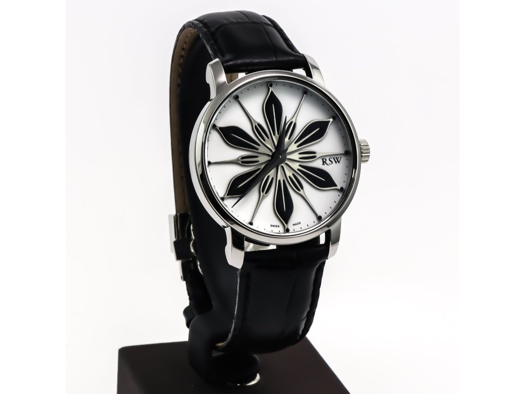 Pánské hodinky RSW RSW9341‑SL‑1 — Swiss Made quartz, 42 mm pouzdro, bílý ciferník s černým květem, safírové sklo, kožený řemínek.