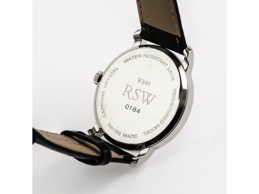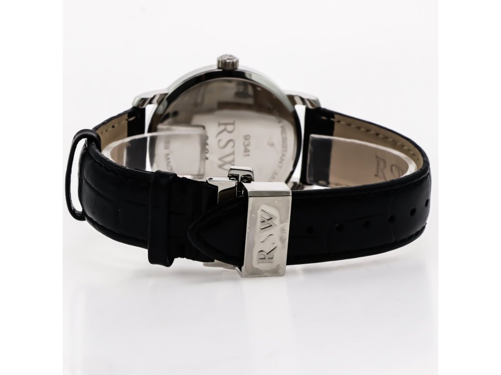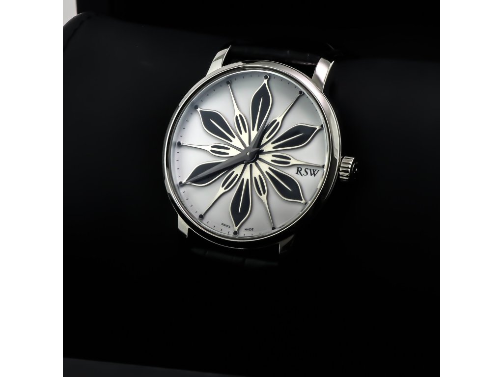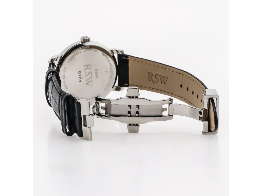 RSW RSW9341‑SL‑1 je pánský model švýcarské značky RSW (Rama Swiss Watch), který zaujme minimalistickým designem s jemným grafickým prvkem. Hodinky mají kulaté pouzdro z leštěné nerezové oceli o průměru 41.85 mm a výšce 7.5 mm, chráněné safírovým sklem. Bílý ciferník bez třpytek je ozdoben decentním černým květinovým motivem, doplněný černými ručkami a bílými indexy. Hodinky pohání švýcarský quartz strojek, který zajišťuje přesný chod. Černý kožený řemínek z pravé kůže o šířce 19.9 mm je zakončen motýlovou sponou. Vodotěsnost činí 30 m (3 ATM). Hodinky jsou nové s 2letou mezinárodní zárukou.
