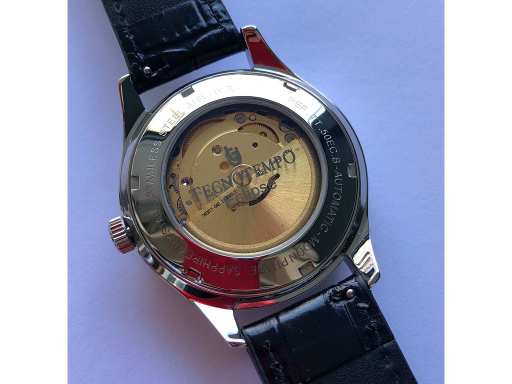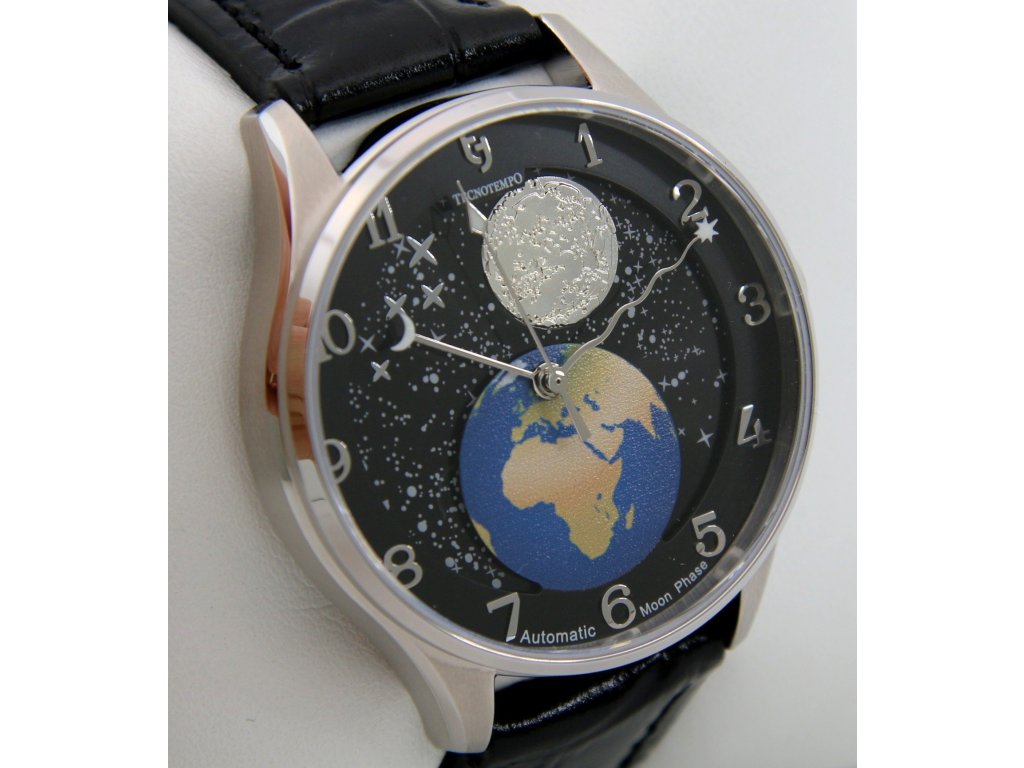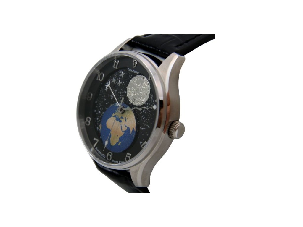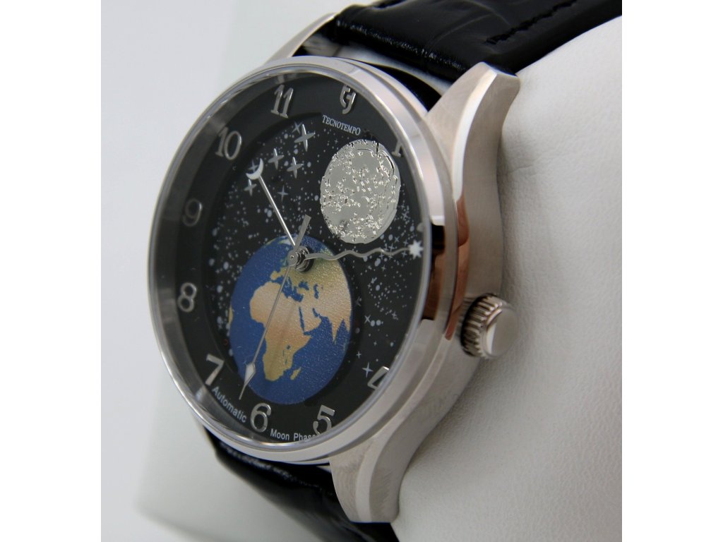 Tecnotempo TT.50EC.B je model z kolekce Eclipse MoonPhase od italské značky Tecnotempo, známé svým důrazem na design a kvalitní komponenty. Hodinky mají pouzdro z nerezové oceli o průměru 41 mm a výšce 13.5 mm, safírové sklo a černý víceúrovňový ciferník s plastickým motivem Měsíce a Země. Ručky jsou stylizované — hodinová s půlměsícem, minutová s hvězdou. Model je vybaven upraveným japonským automatickým strojkem Miyota, který zobrazuje fáze Měsíce v cyklu 31 dní. Doporučuje se neměnit pozici Měsíce mezi 20:00 a 03:00 kvůli ochraně mechanismu. Hodinky jsou s dokumentací a 2letou zárukou.